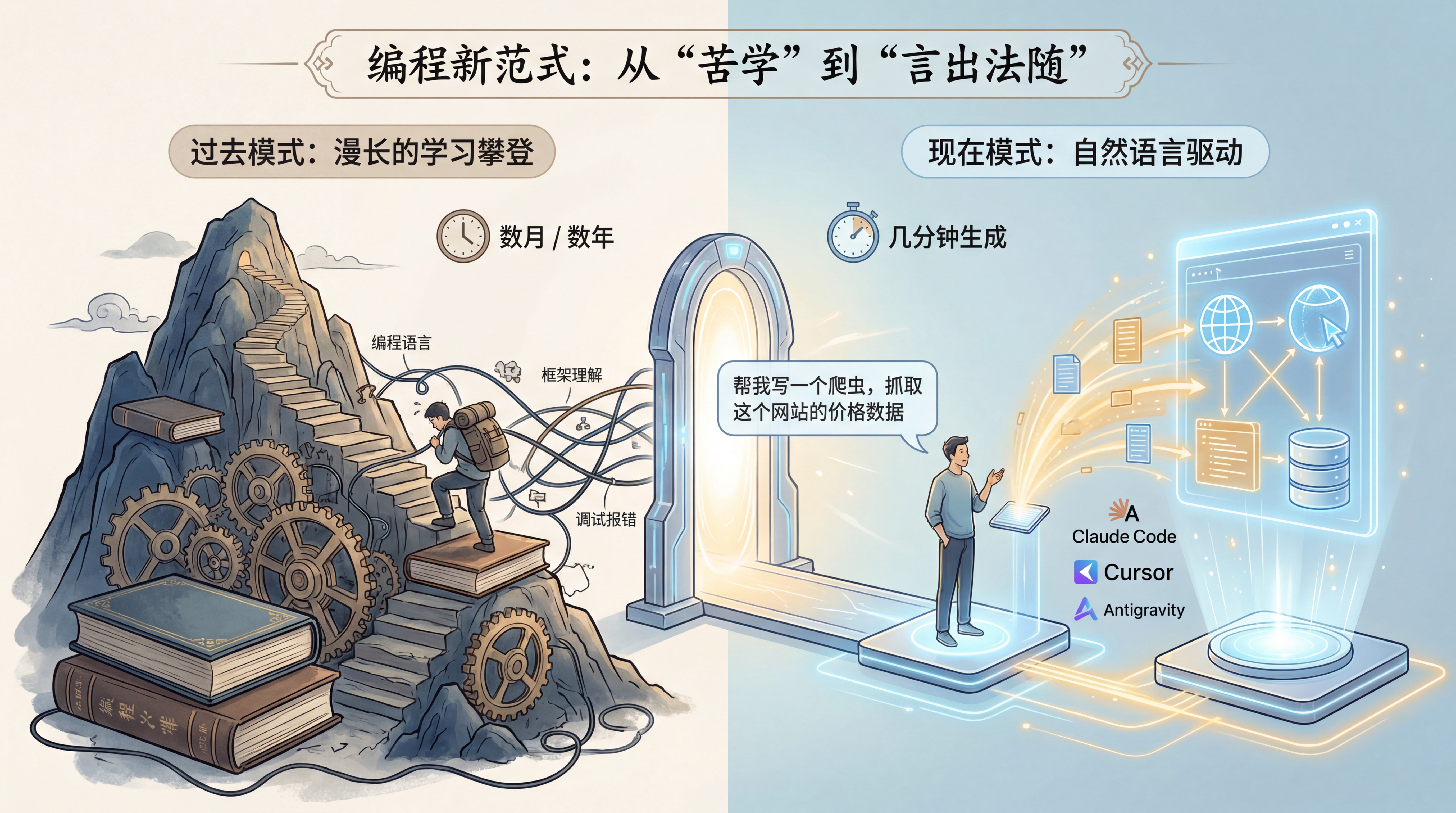现在,使用 Claude Code、Cursor、Antigravity 这类工具,你只需要用自然语言描述需求。“帮我写一个爬虫,抓取这个网站的价格数据”——几分钟后,代码就生成了。