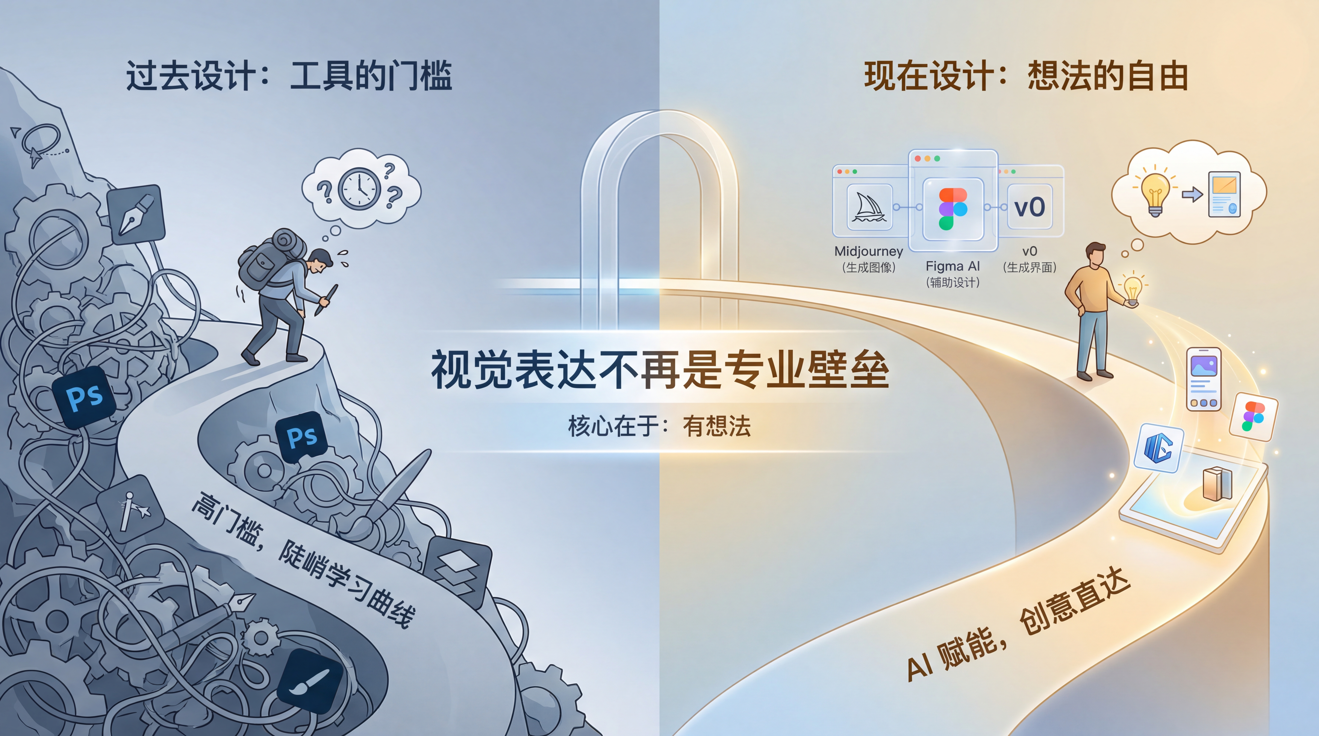 Photoshop 的学习曲线曾经劝退无数人。现在,Midjourney、NanobananaPro 生成图像,Figma AI 辅助设计,v0 直接生成前端界面。