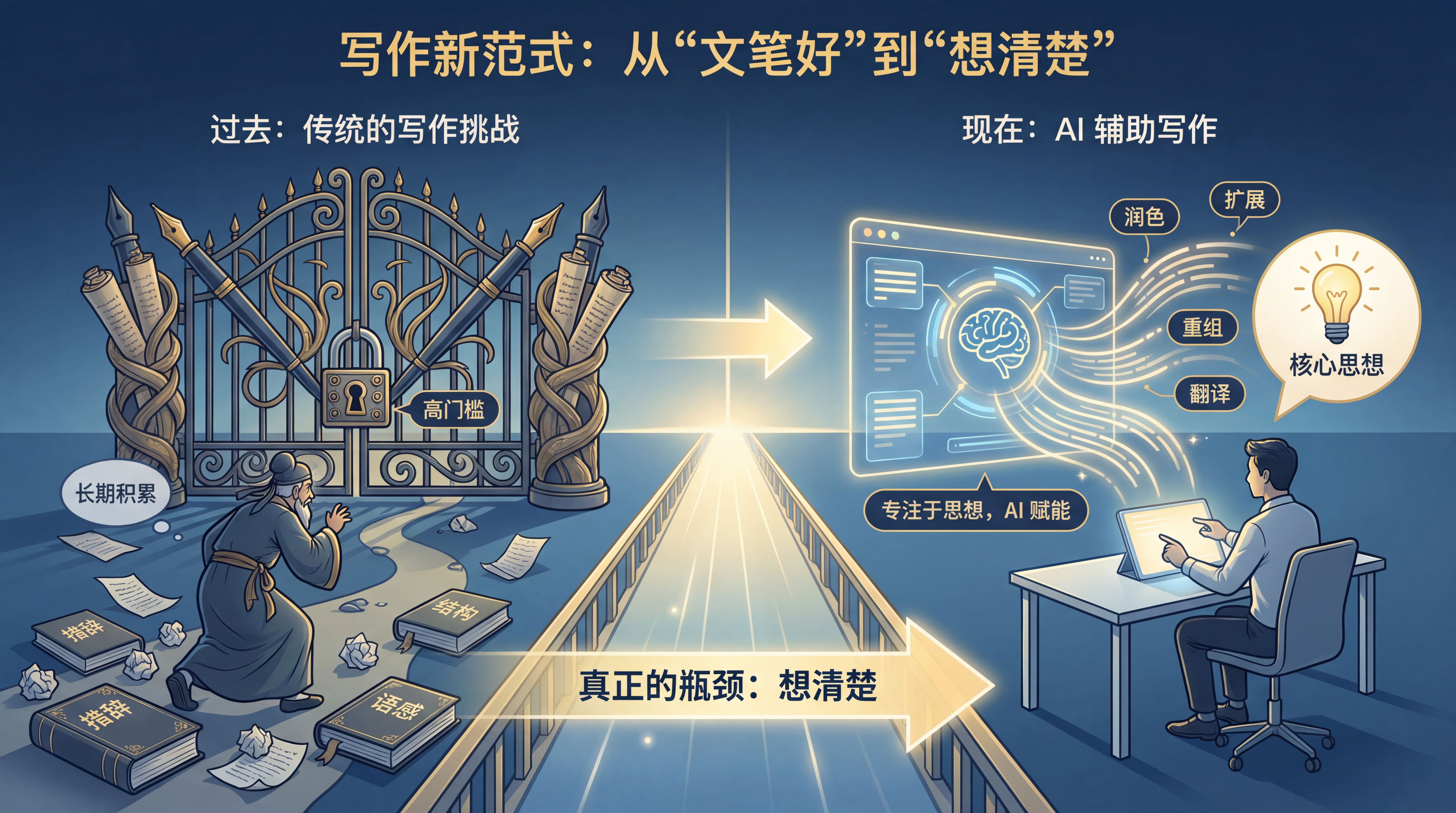 现在,AI 可以帮你润色、扩展、重组、翻译。真正的瓶颈不再是”能不能写出来”,而是”你想表达什么”。