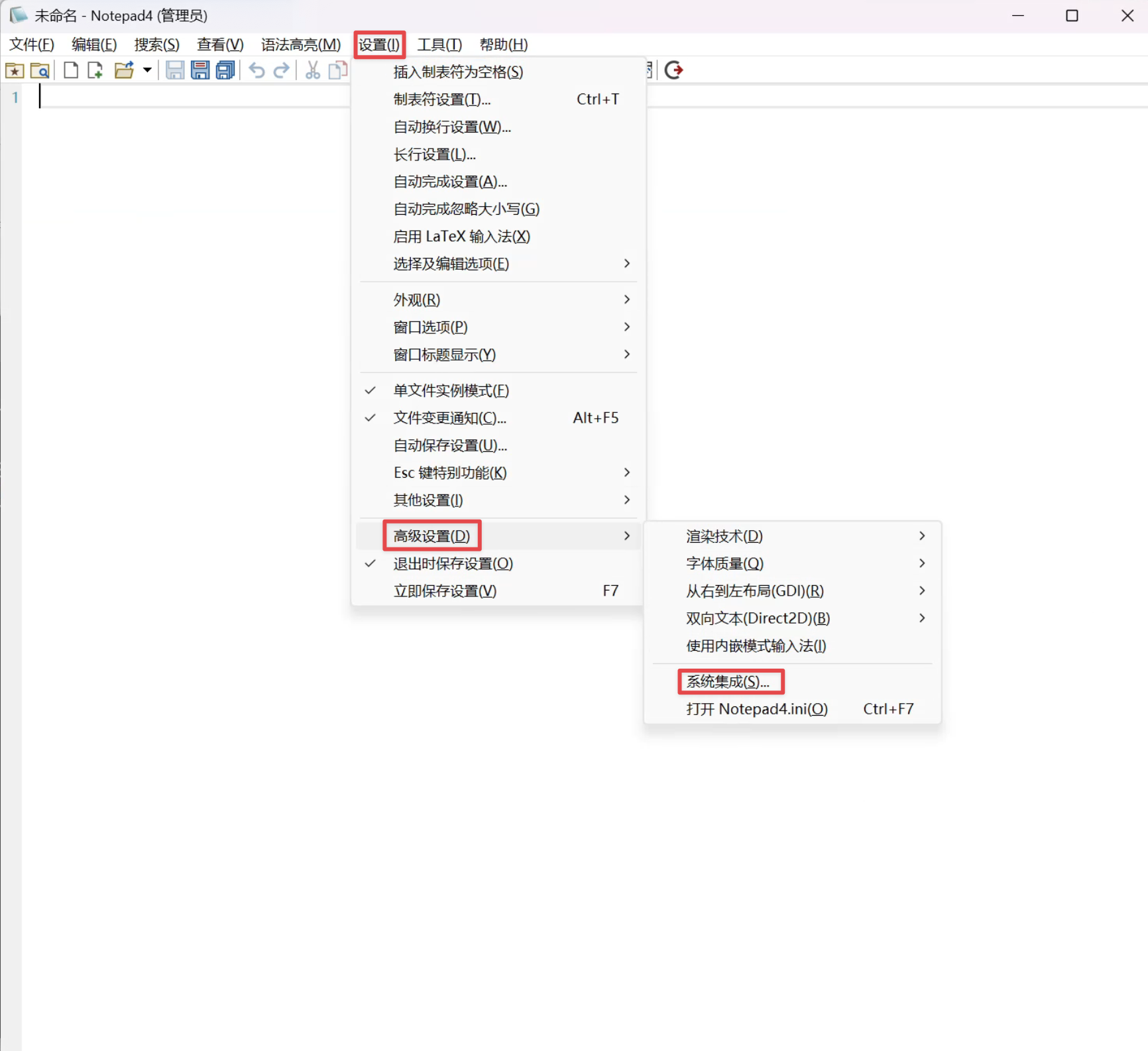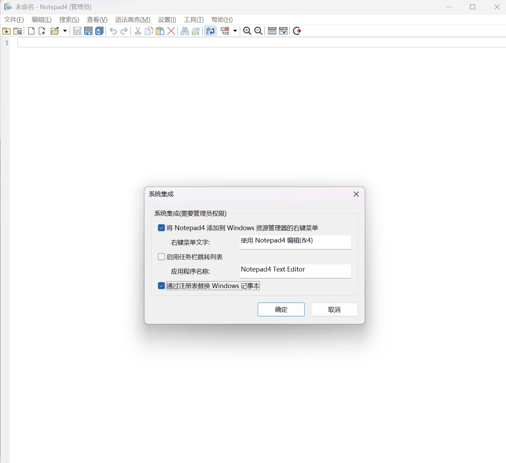 使用命令 Notepad4 打开,使用系统集成设置替换系统记事本和快捷打开方式: