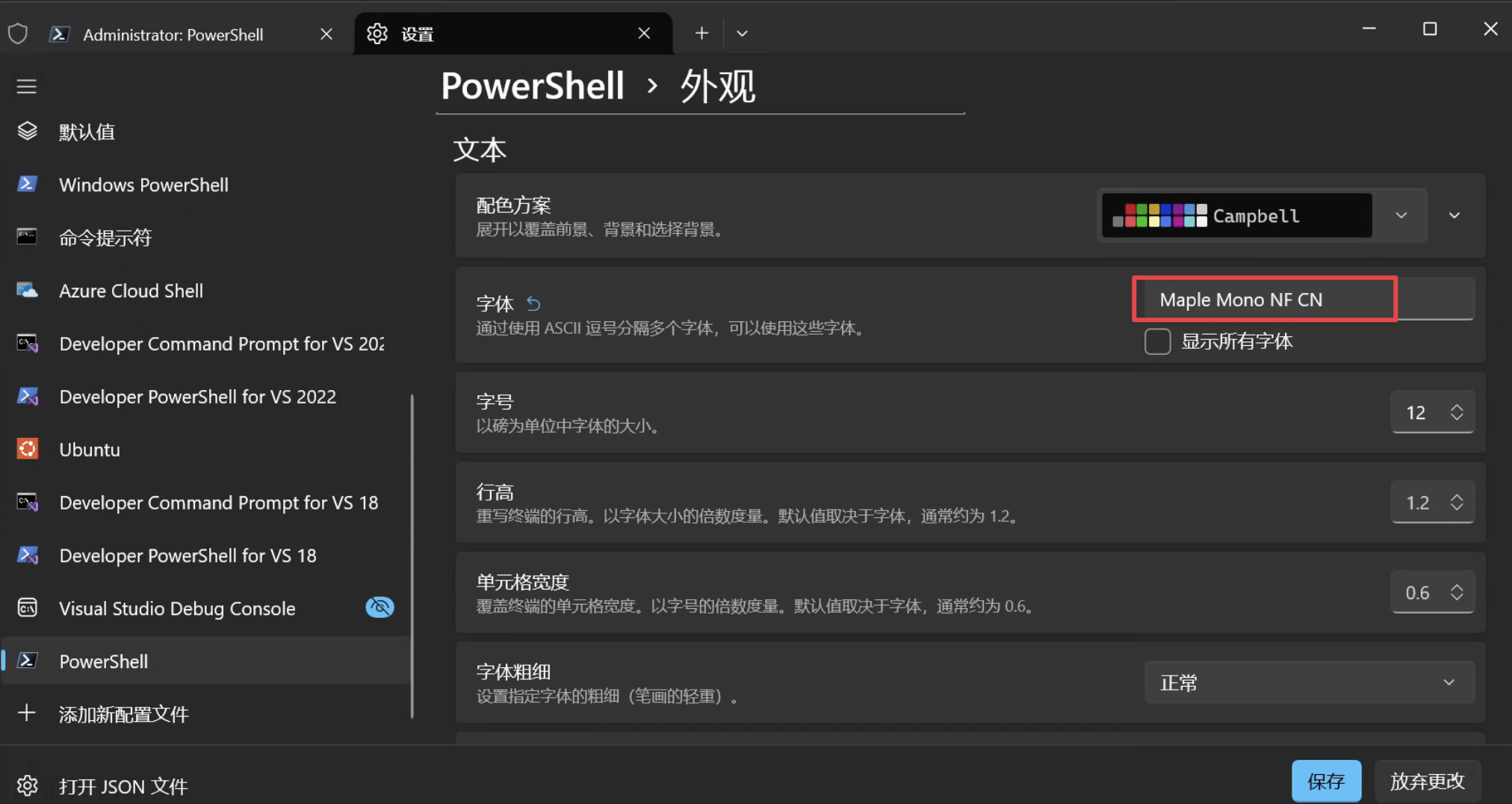 打开 PowerShell 修改默认字体为 Maple Mono Normal NF CN