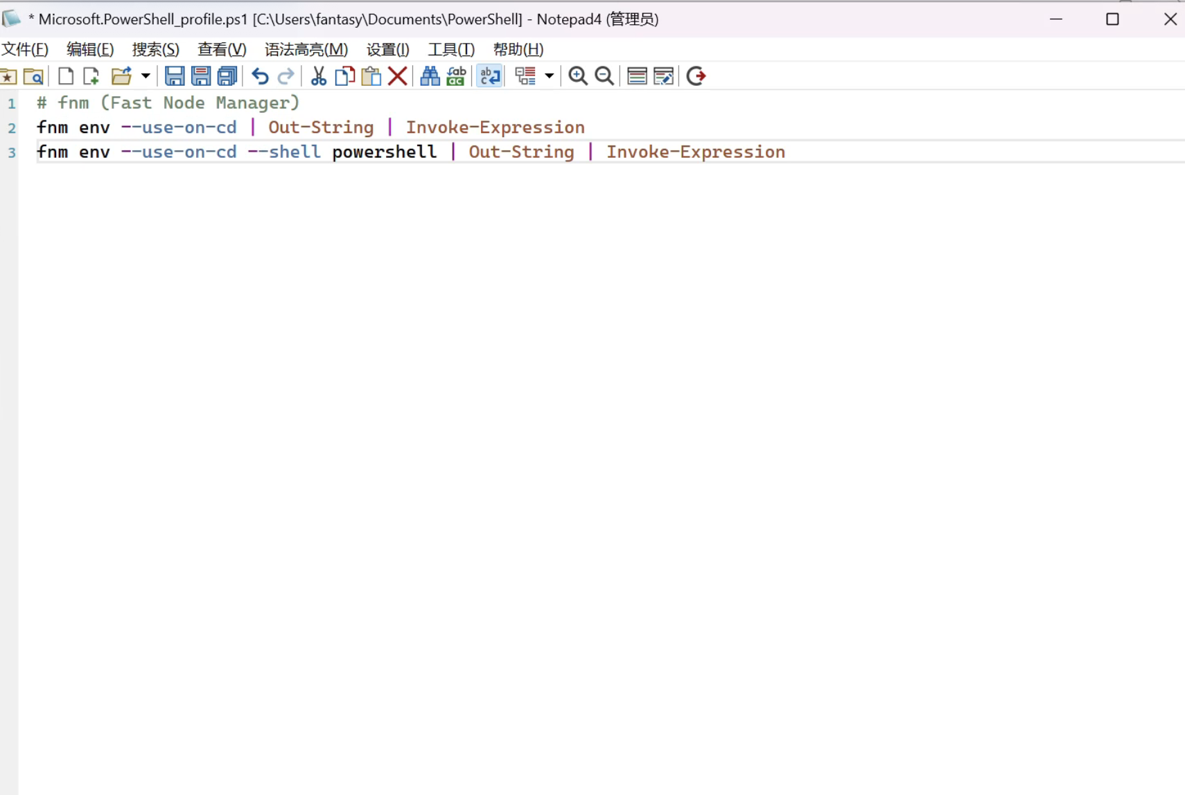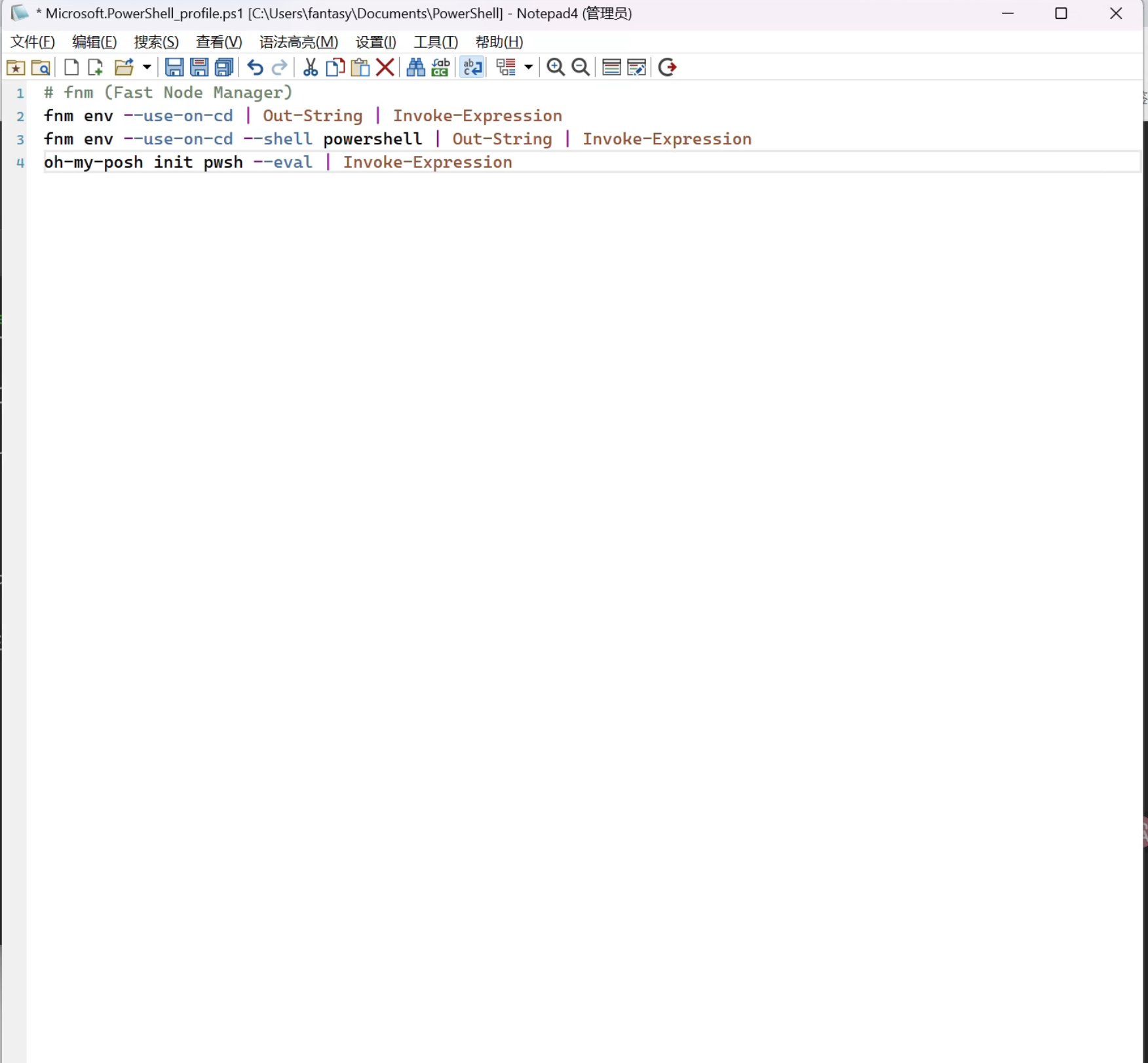 完成后再次使用命令 notepad $profile 打开,添加以下内容后保存: