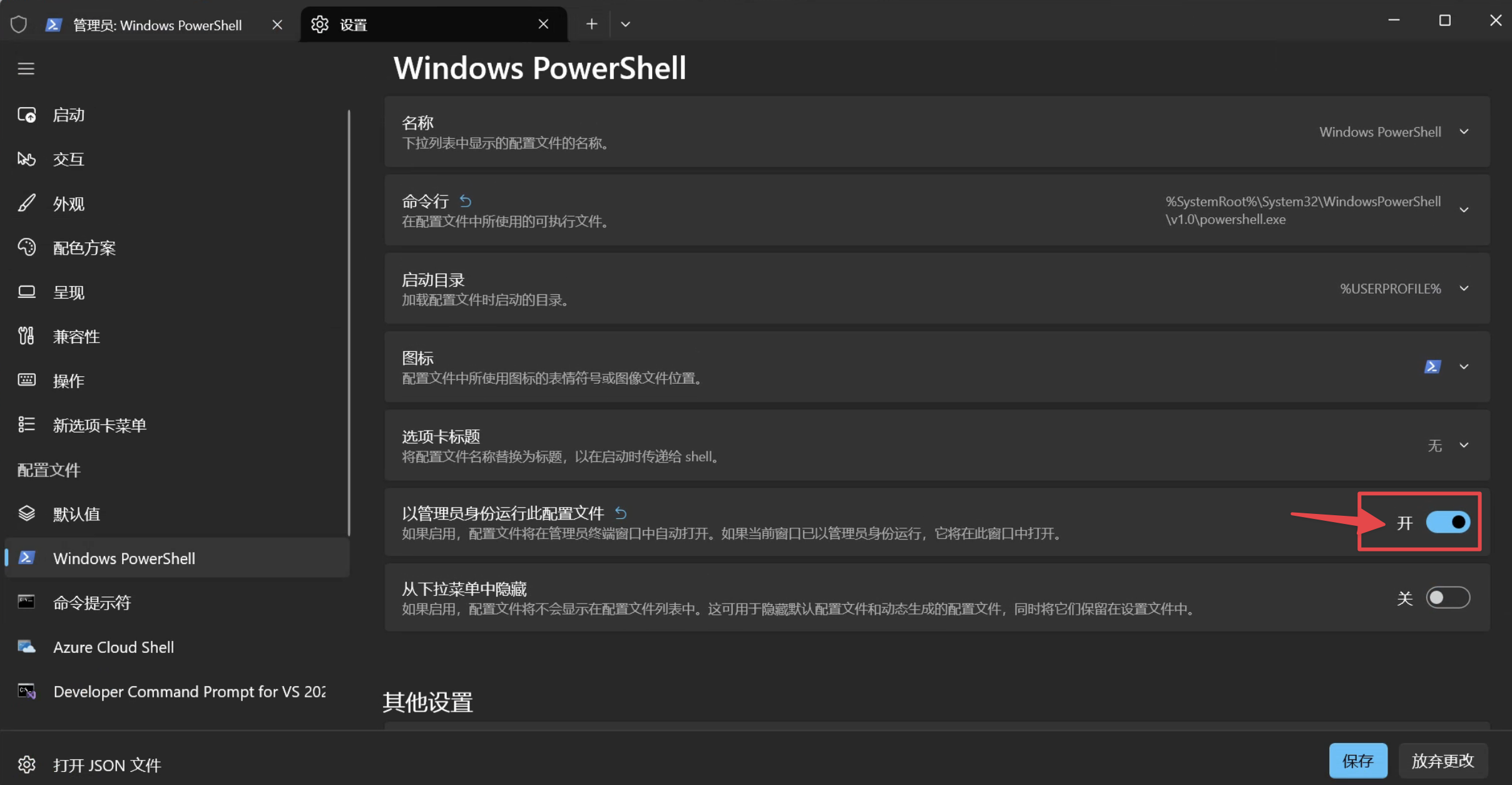 安装好后,设定默认打开系统内置 PowerShell 并且给予默认管理员权限: